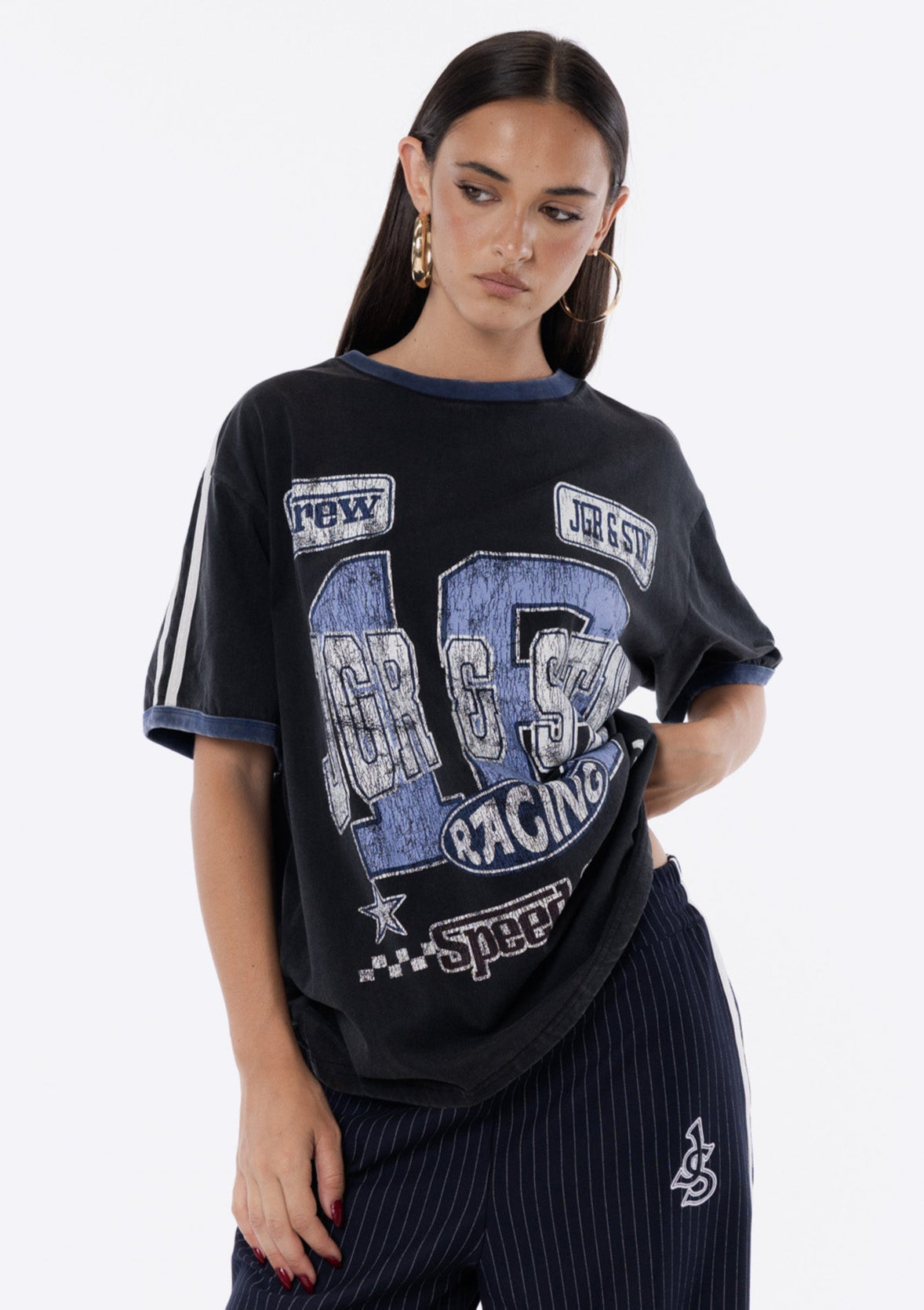 Introducing the JGR & STN Speed Club Oversized Tee. This tee is an oversized fit and crafted from soft, vintage-feel fabric. Featuring JGR & STN branding and graphic print.