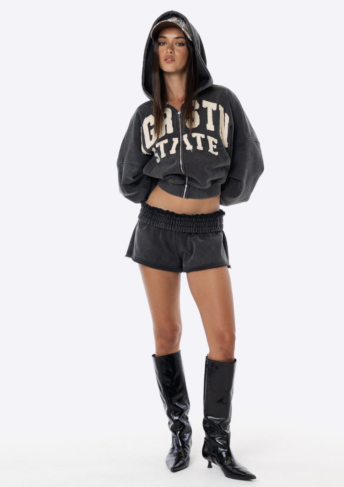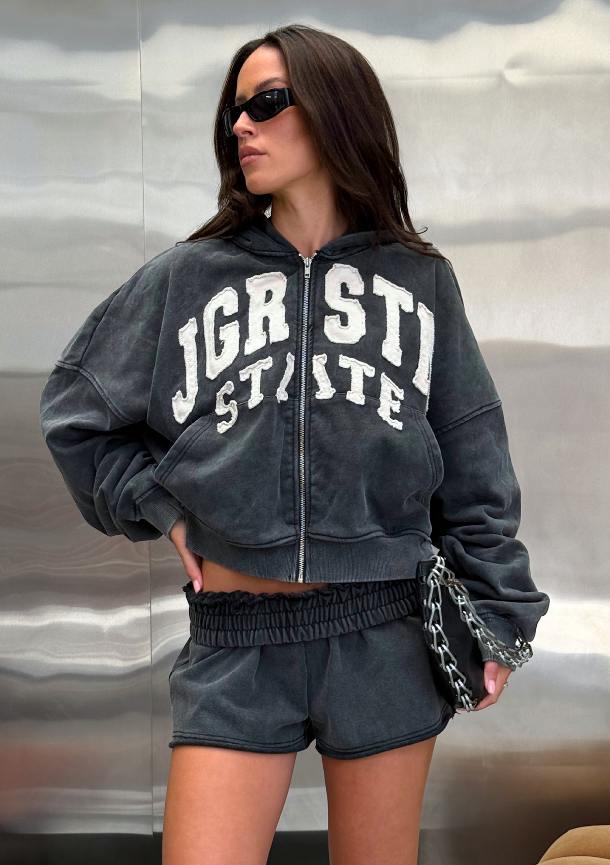 Introducing the JGR & STN Mimi Shorties. Designed to match back with our Mimi Zip Thru Hoodie. A mini short design with applique logo across the back.