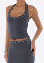 Introducing the JGR & STN Zali Halter Top. Made from a soft modal fabric featuring eyelet details around the neckline. Pairs perfectly with the Zali Maxi Skirt.