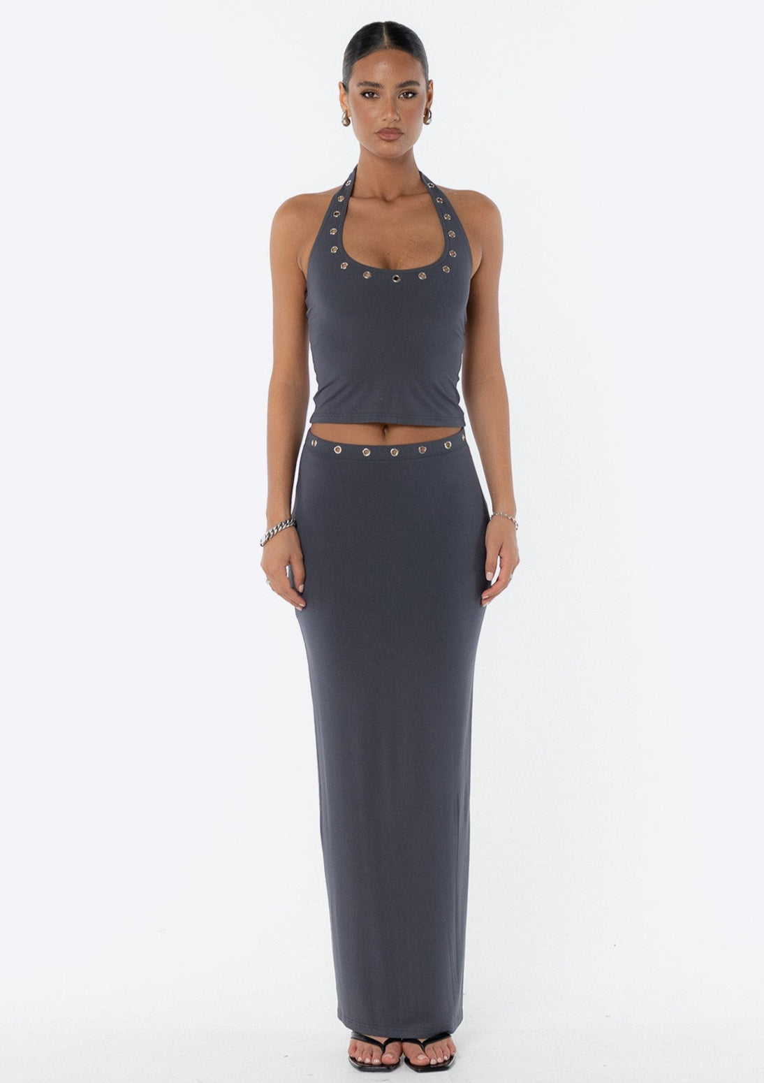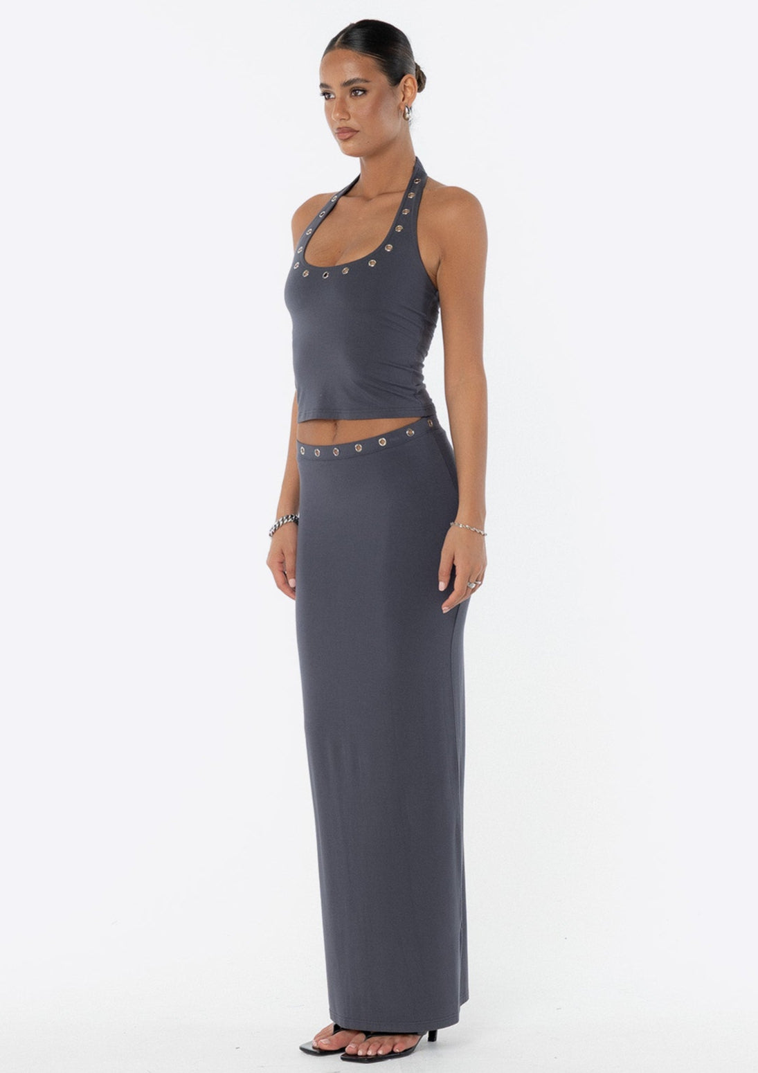 Introducing the JGR & STN Zali Maxi Skirt. A flattering straight silhouette with eyelet details along the waistline. Designed to wear high or low waisted. Pairs perfectly with the Zali Halter Top.