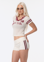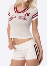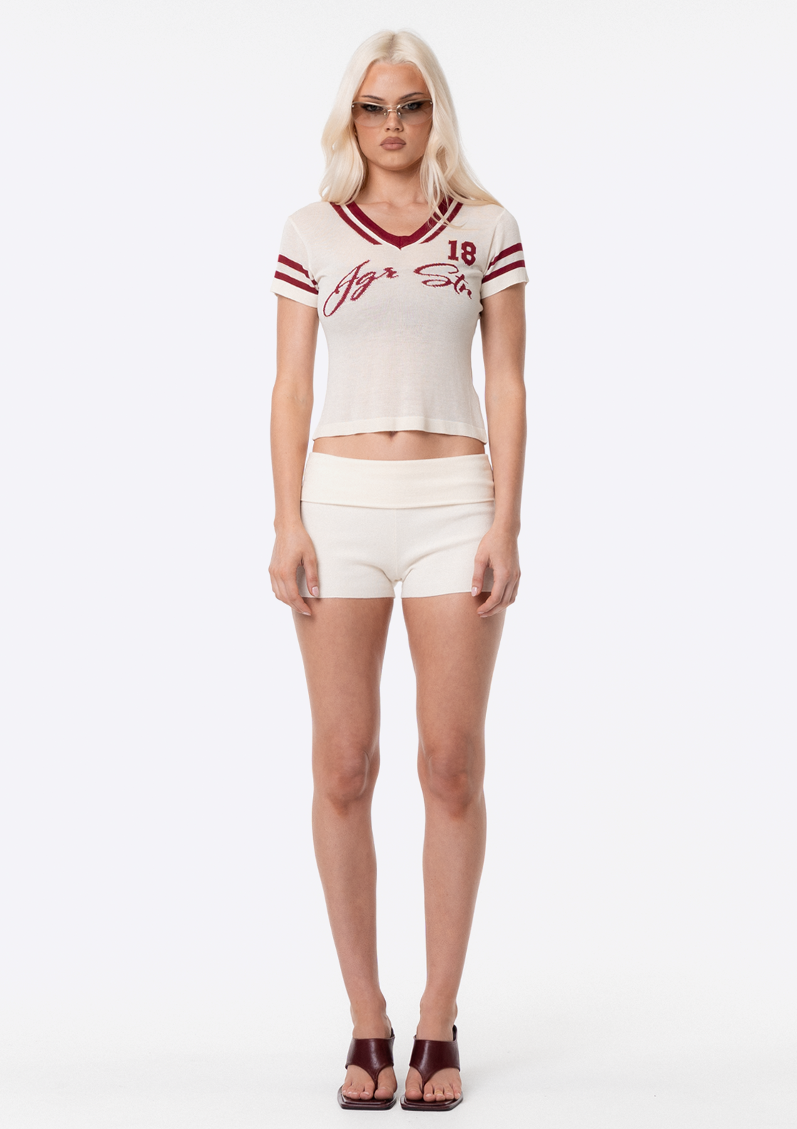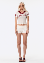 Introducing the JGR & STN Tace Knit Shorts. Made in a stretch rib fabric with an engineered stripe on side. Featuring a fold over waistband.