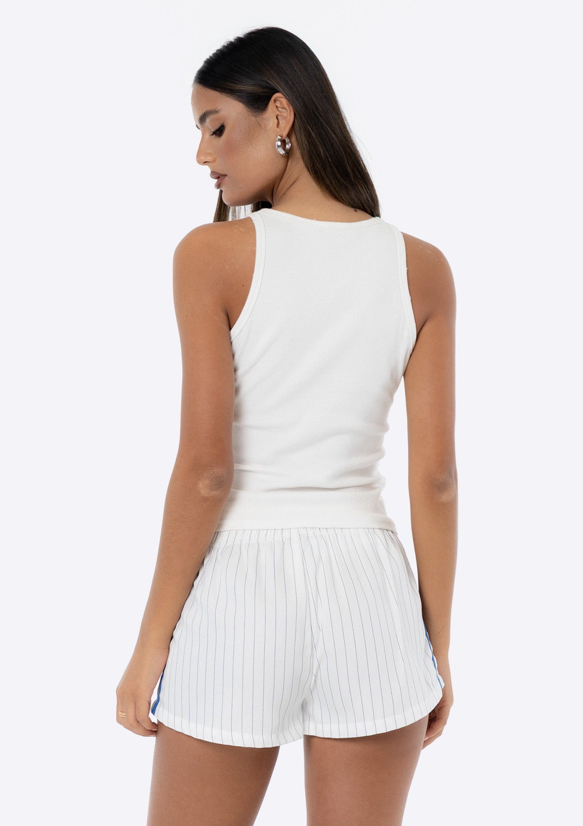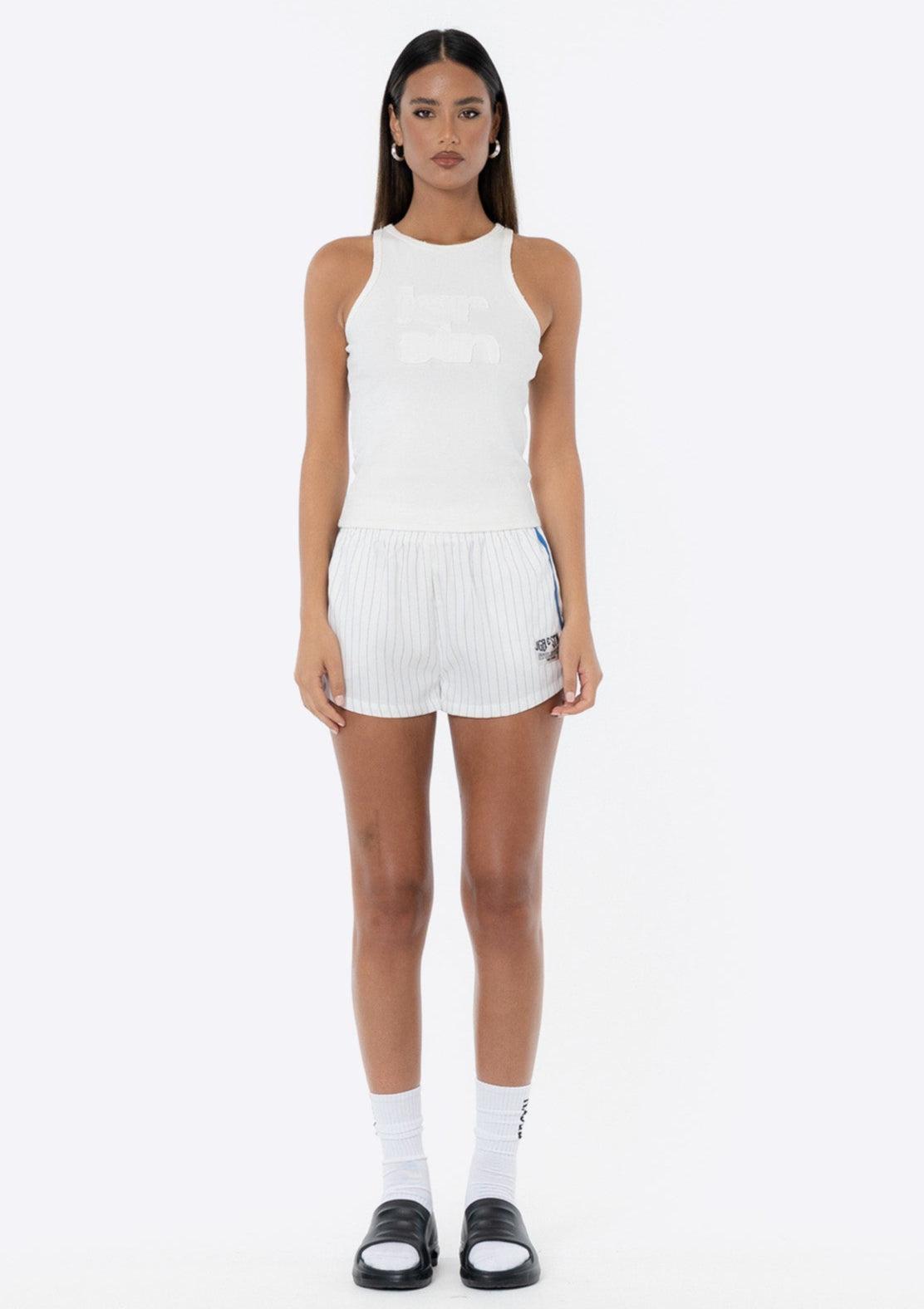 Introducing the JGR & STN Sadie Boxer Shorts. The perfect boxer short designed to be comfortable and elevate an outfit. Crafted in a white pinstripe fabric and blue piping on the side.