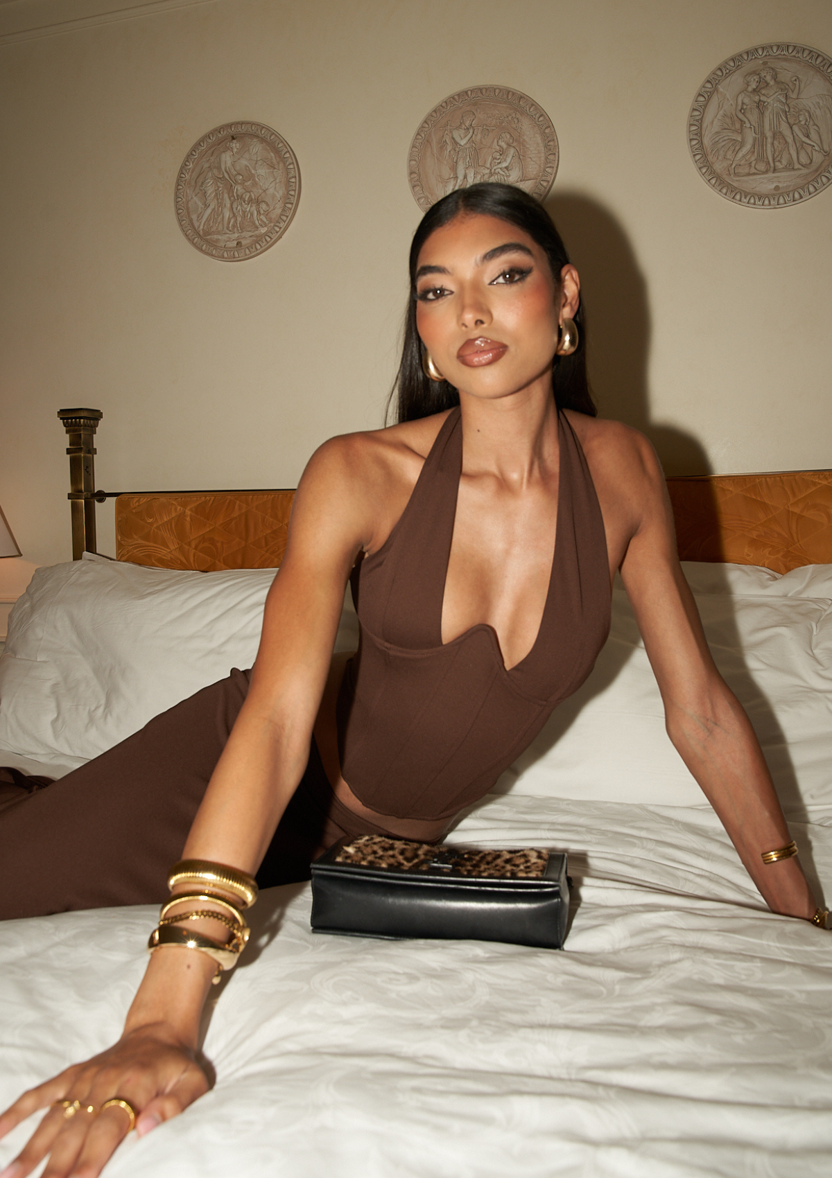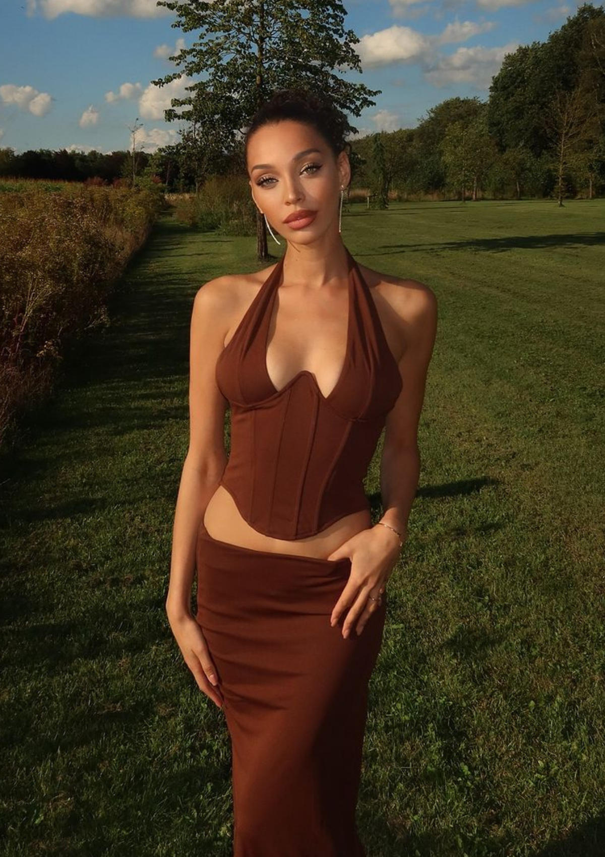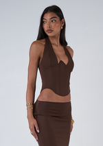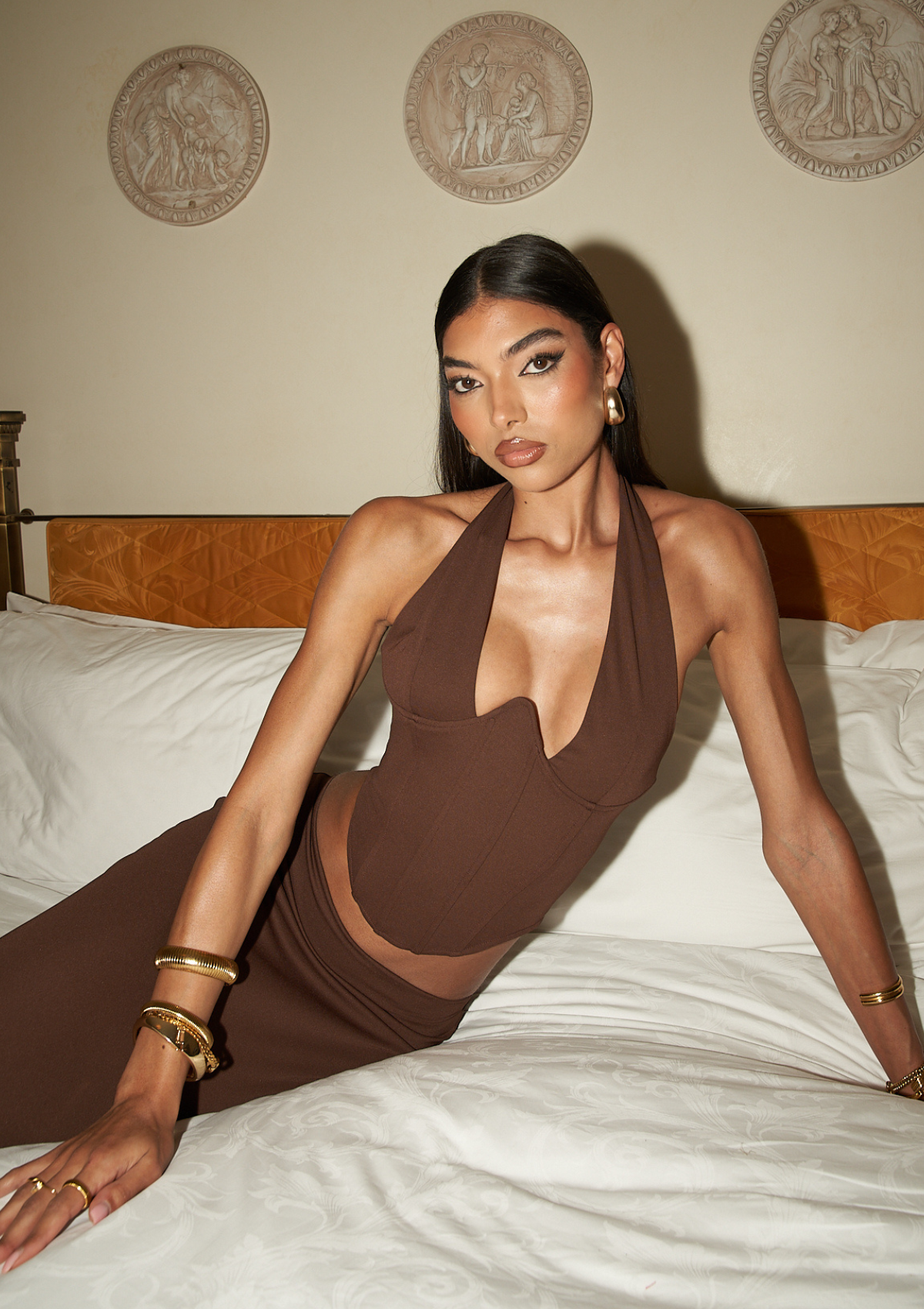 Introducing the JGR & STN Harlow Corset Top. Crafted from stretch fabric, this top features a halter neck design and plunges at the bust. Pair this with the Harlow Maxi Skirt.