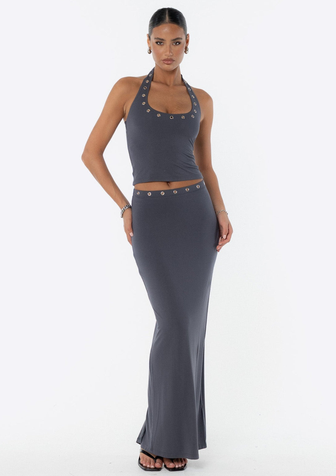 Introducing the JGR & STN Zali Maxi Skirt. A flattering straight silhouette with eyelet details along the waistline. Designed to wear high or low waisted. Pairs perfectly with the Zali Halter Top.
