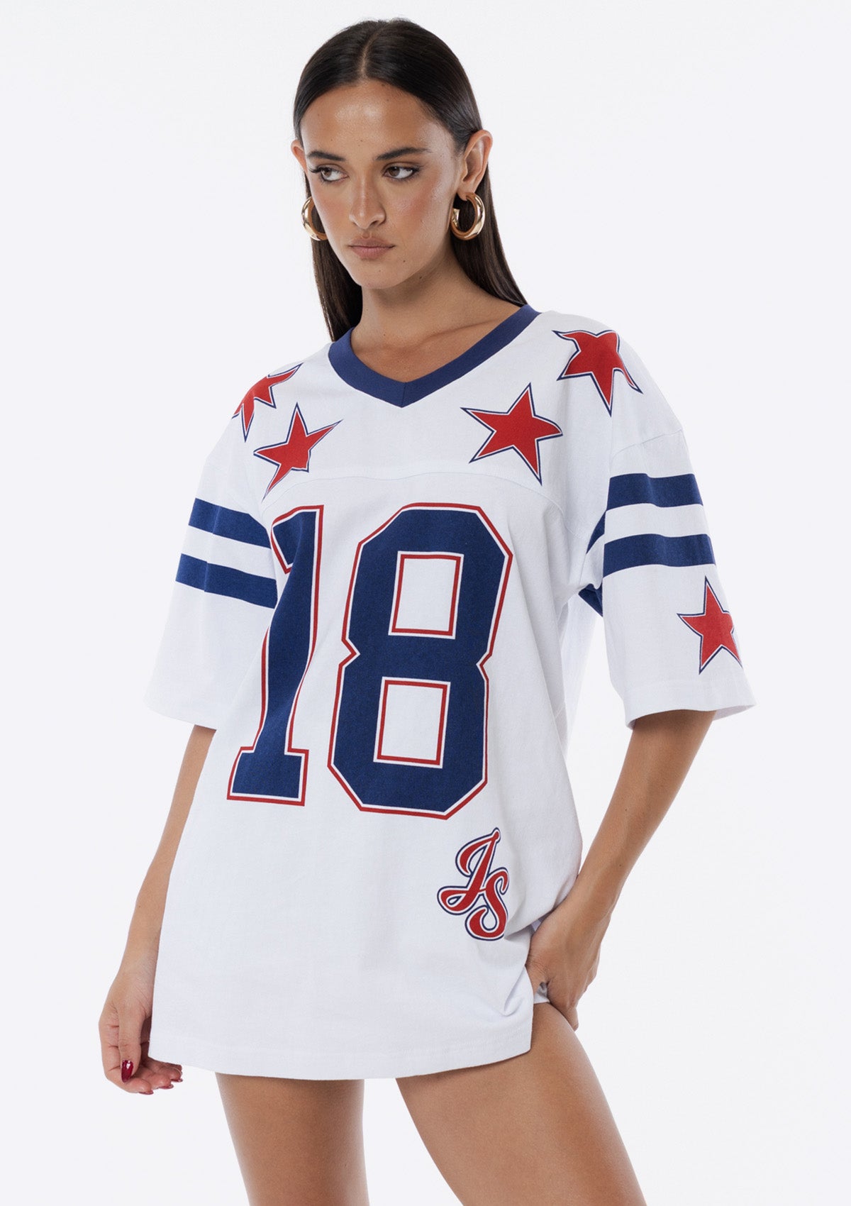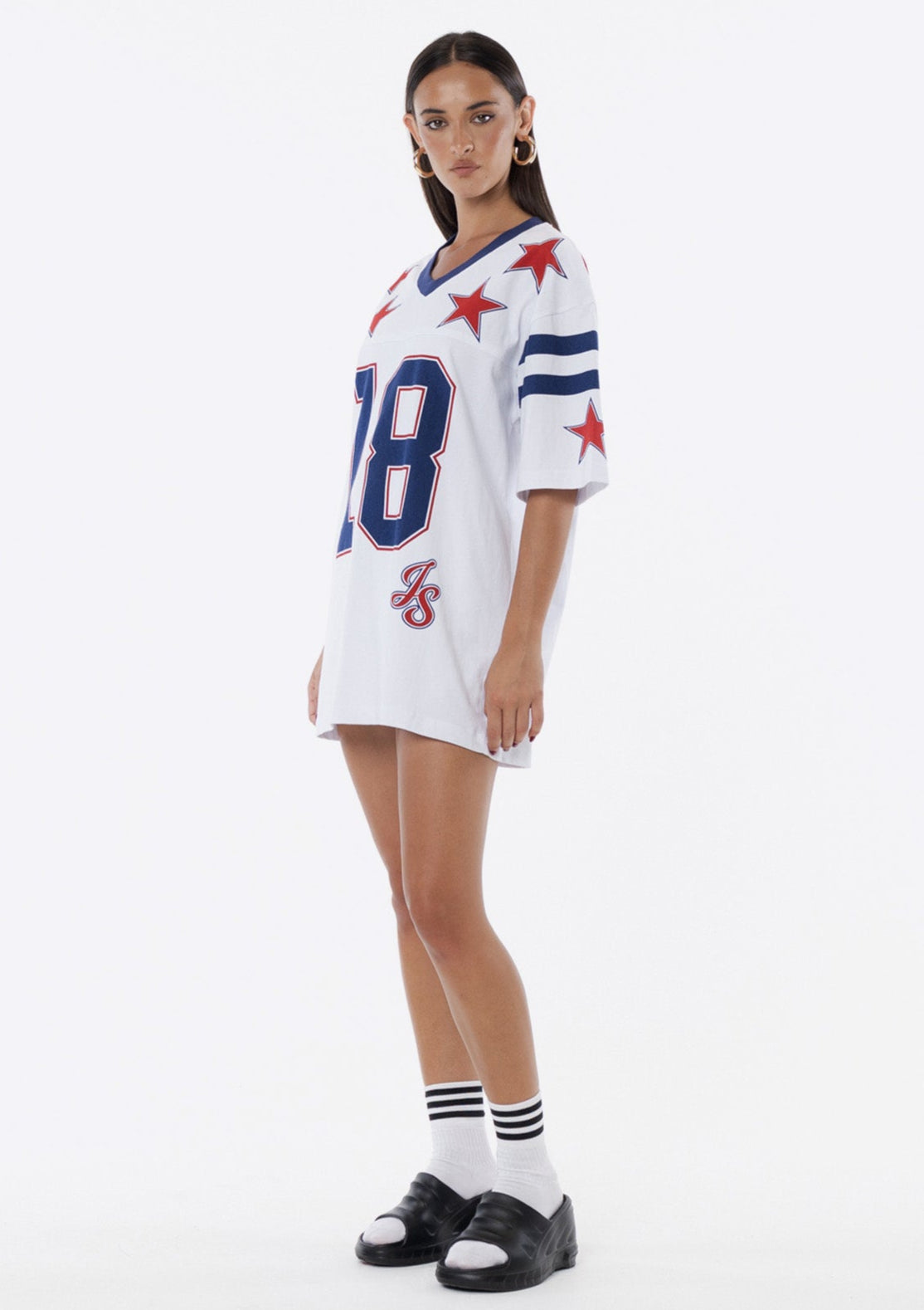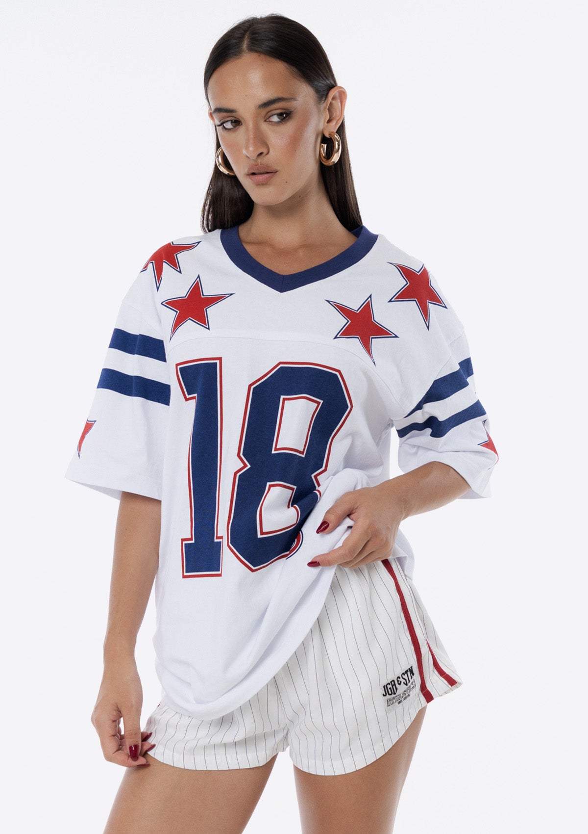 Introducing the JGR & STN Aria Oversized Tee. This tee is an oversized fit and the design is inspired by vintage sports jerseys. Featuring JGR & STN branding and graphic prints.