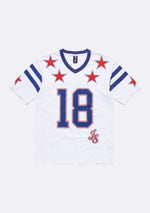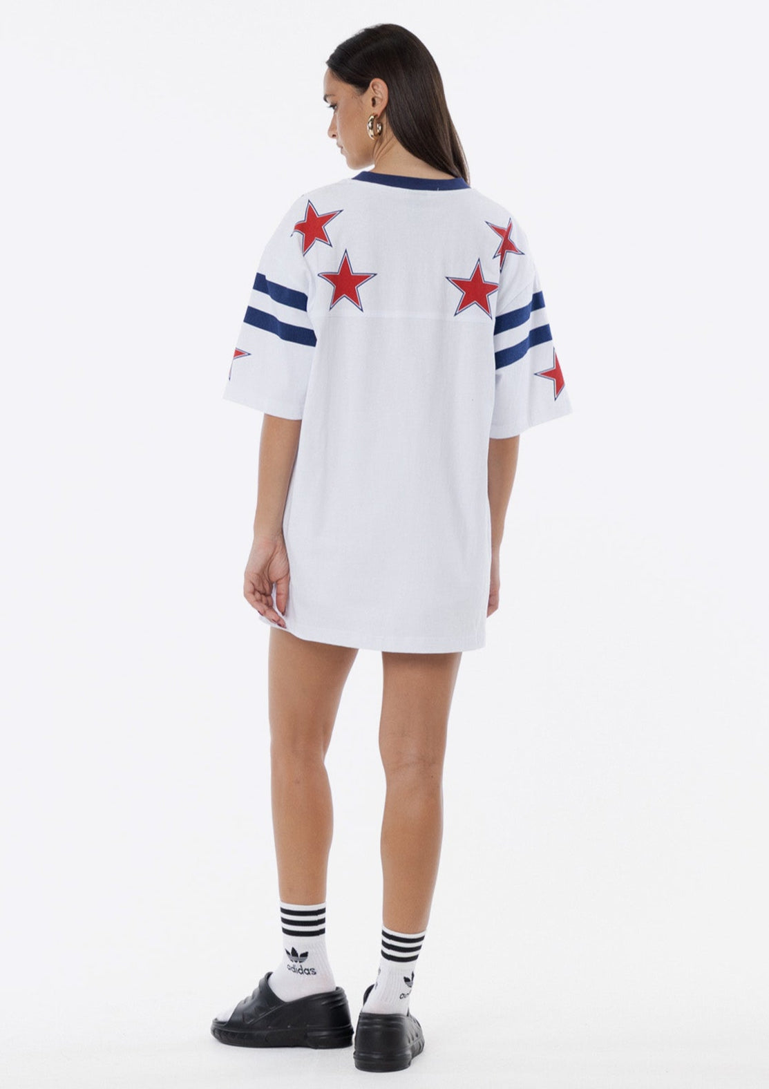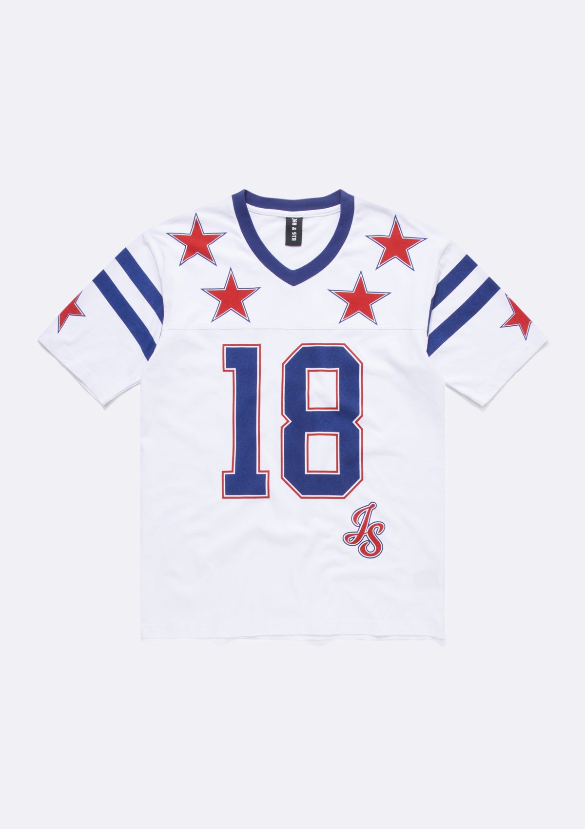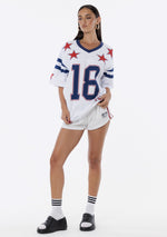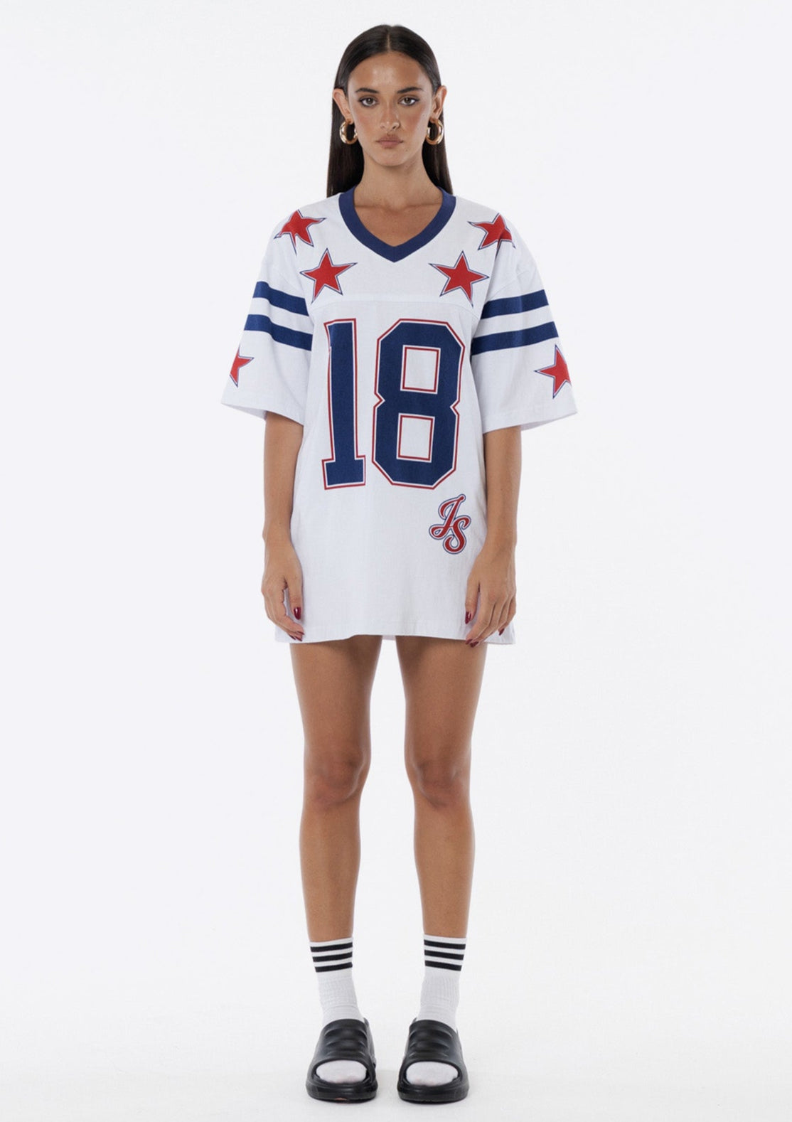 Introducing the JGR & STN Aria Oversized Tee. This tee is an oversized fit and the design is inspired by vintage sports jerseys. Featuring JGR & STN branding and graphic prints.