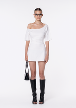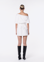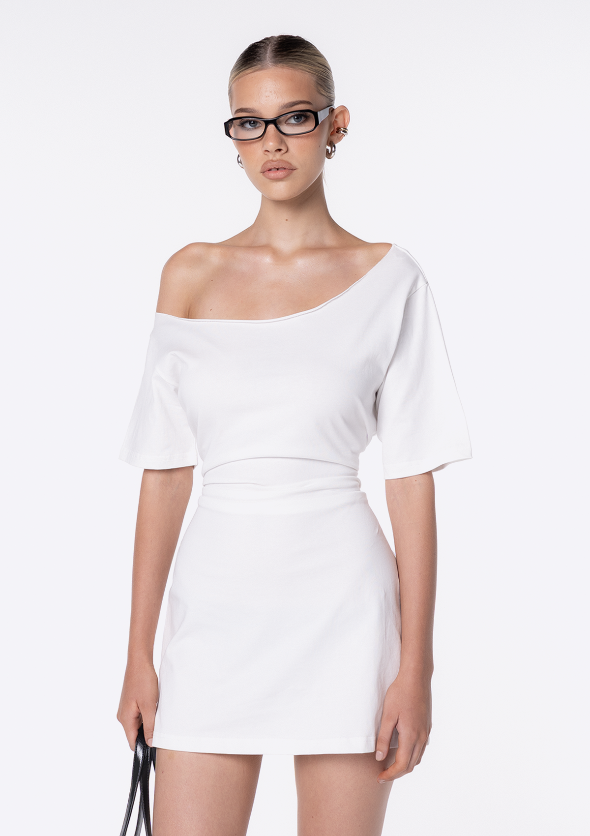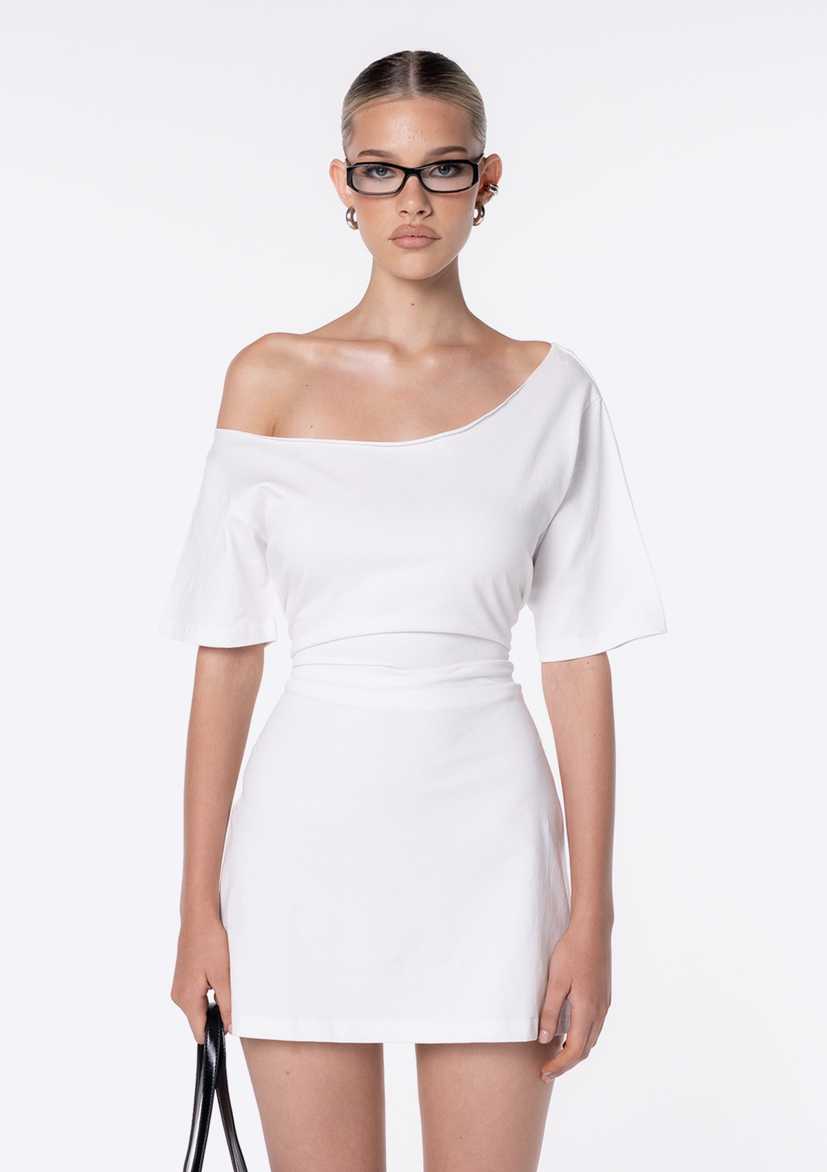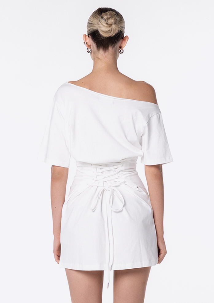 Introducing the JGR & STN Cinched Tee Mini Dress. An off-the-shoulder mini dress with an adjustable lace-up back for custom cinching. Designed to sit effortlessly cool and relaxed - size down for a more fitted look.