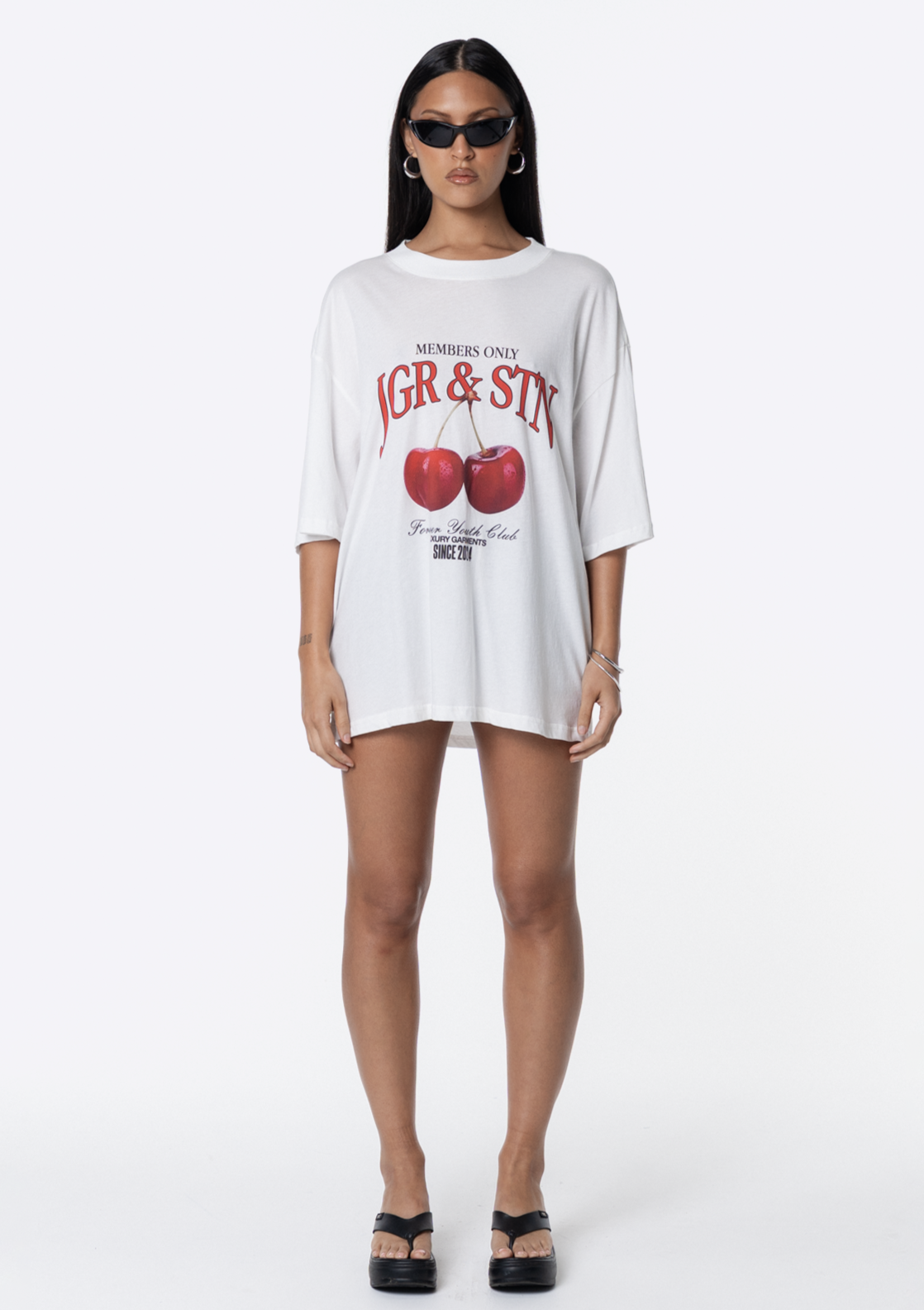 Introducing the JGR & STN Cherry Oversized Tee. Crafted in a soft, vintage-feel fabric and featuring printed graphics on the front.
