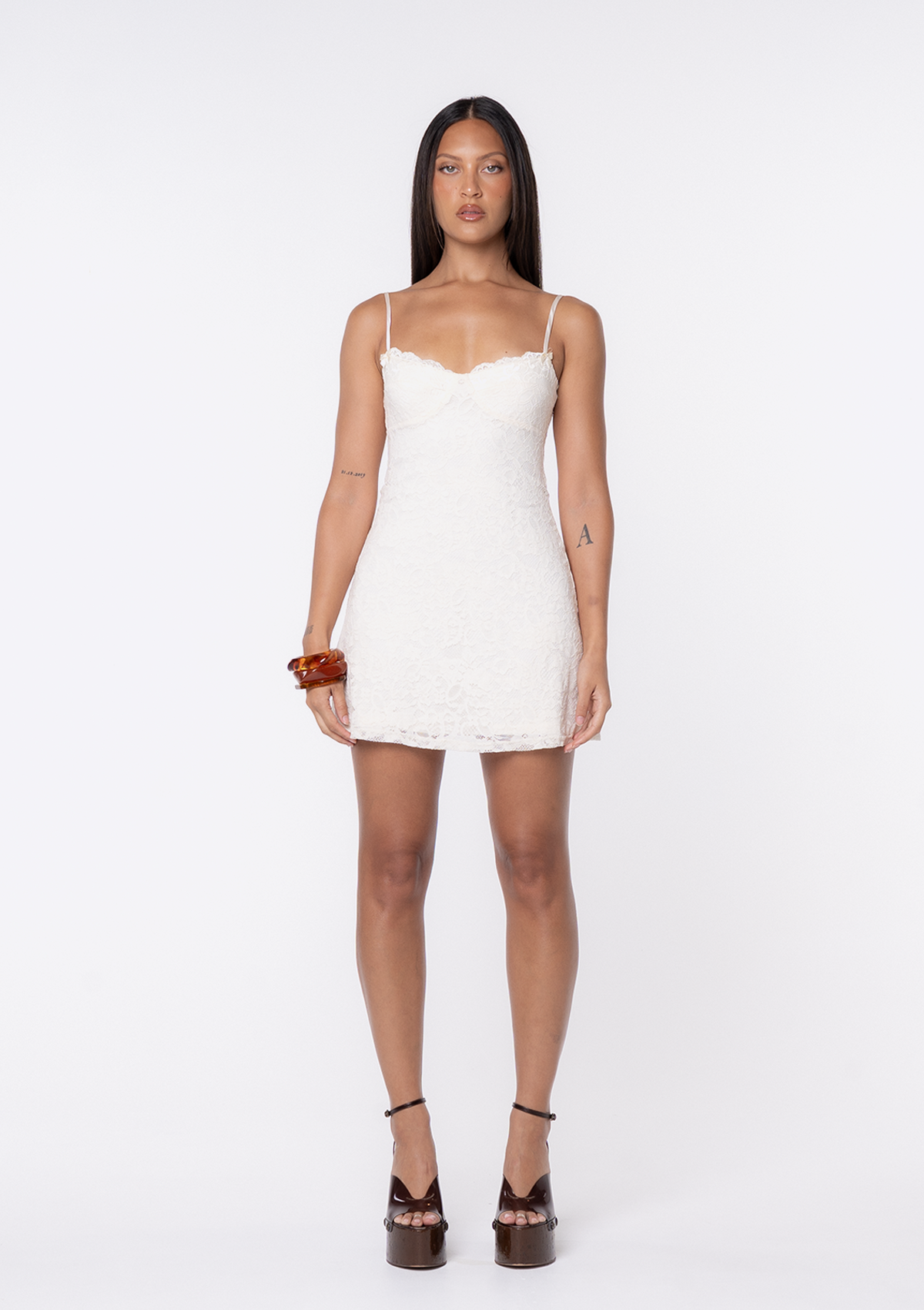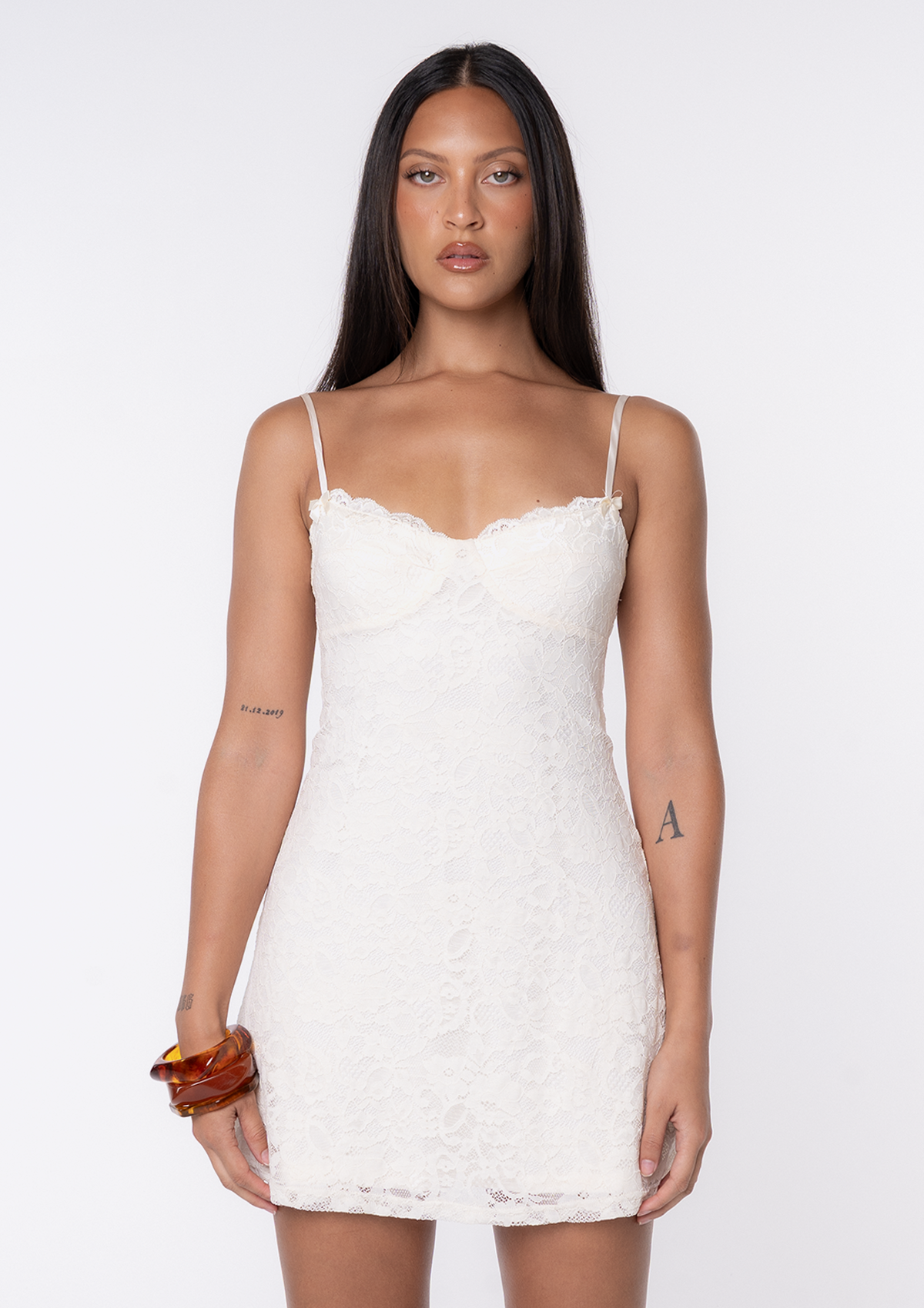 Introducing the JGR & STN Ally Mini Dress. An update to our best selling Freya Mini Dress. Featuring an all over off-white lace fabric and is fully lined. The waist sculpts the body and then softens to a flattering A-line skirt shape.
