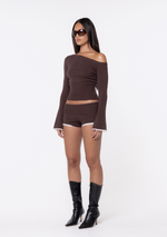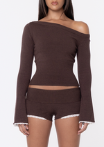 Introducing the JGR & STN Carmilla Knit Short. A cheeky mini short with a ribbed fold over panel at the waist for a flattering fit. Featuring a lace trim on the hem. Pairs perfectly with the Carmilla Knit Short.