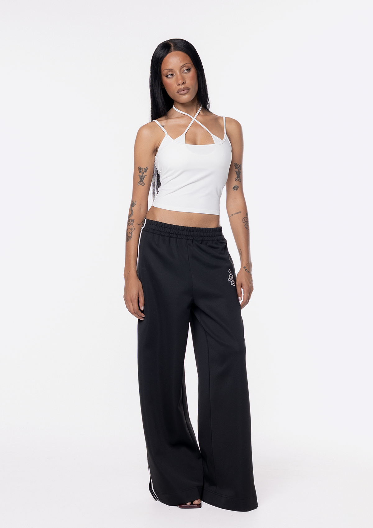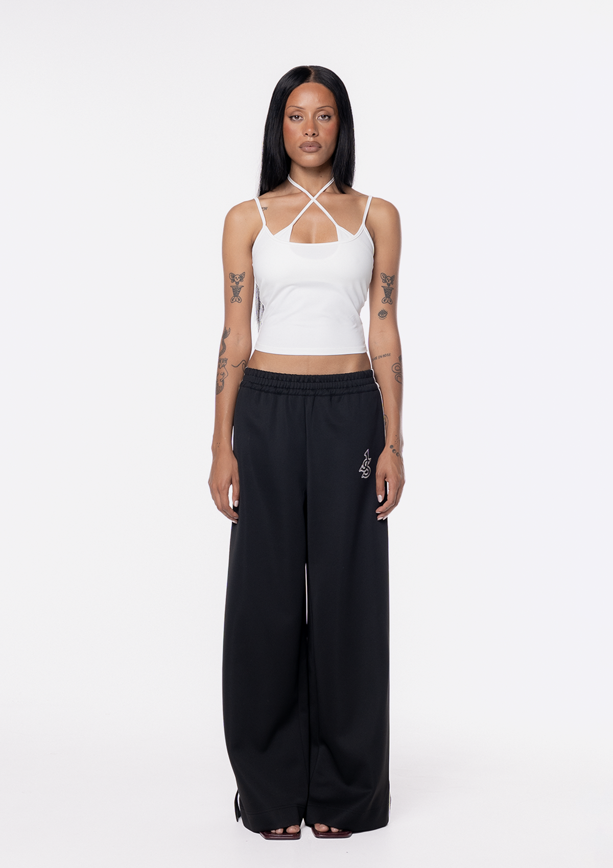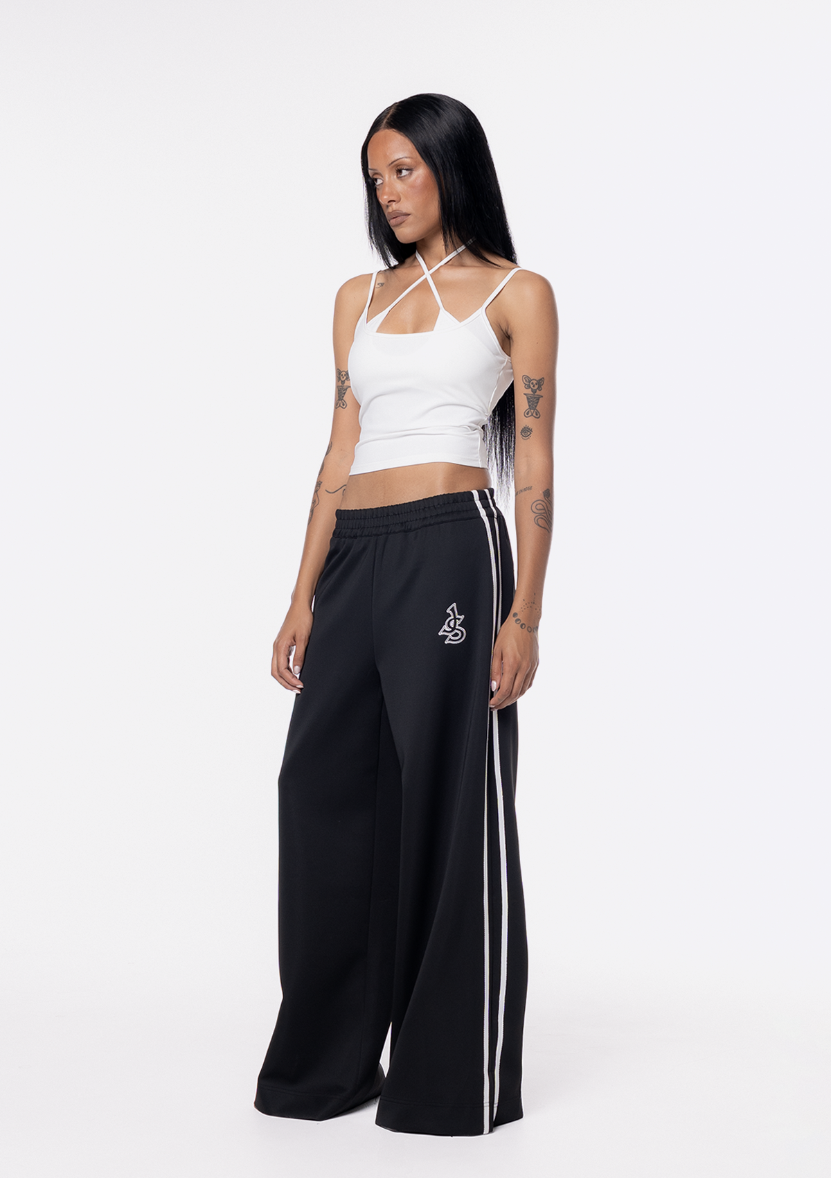 Introducing the JGR & STN Ebony Wide Leg Track Pant. The track pant designed to be elevated and styled back with everyday basics. Featuring an embroidered J&S logo. Designed with a relaxed, elongated leg. If you'd prefer a shorter fit, try folding the waistband or opting for a size down.