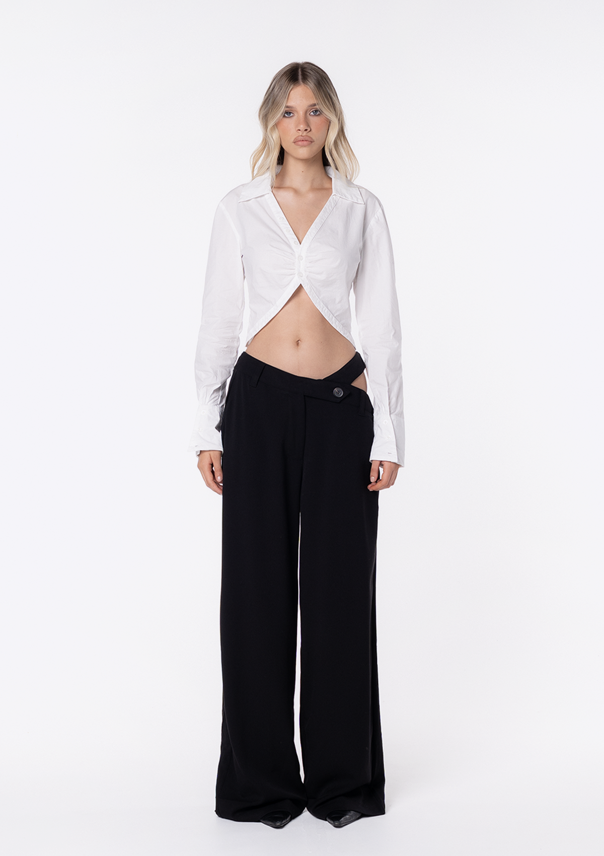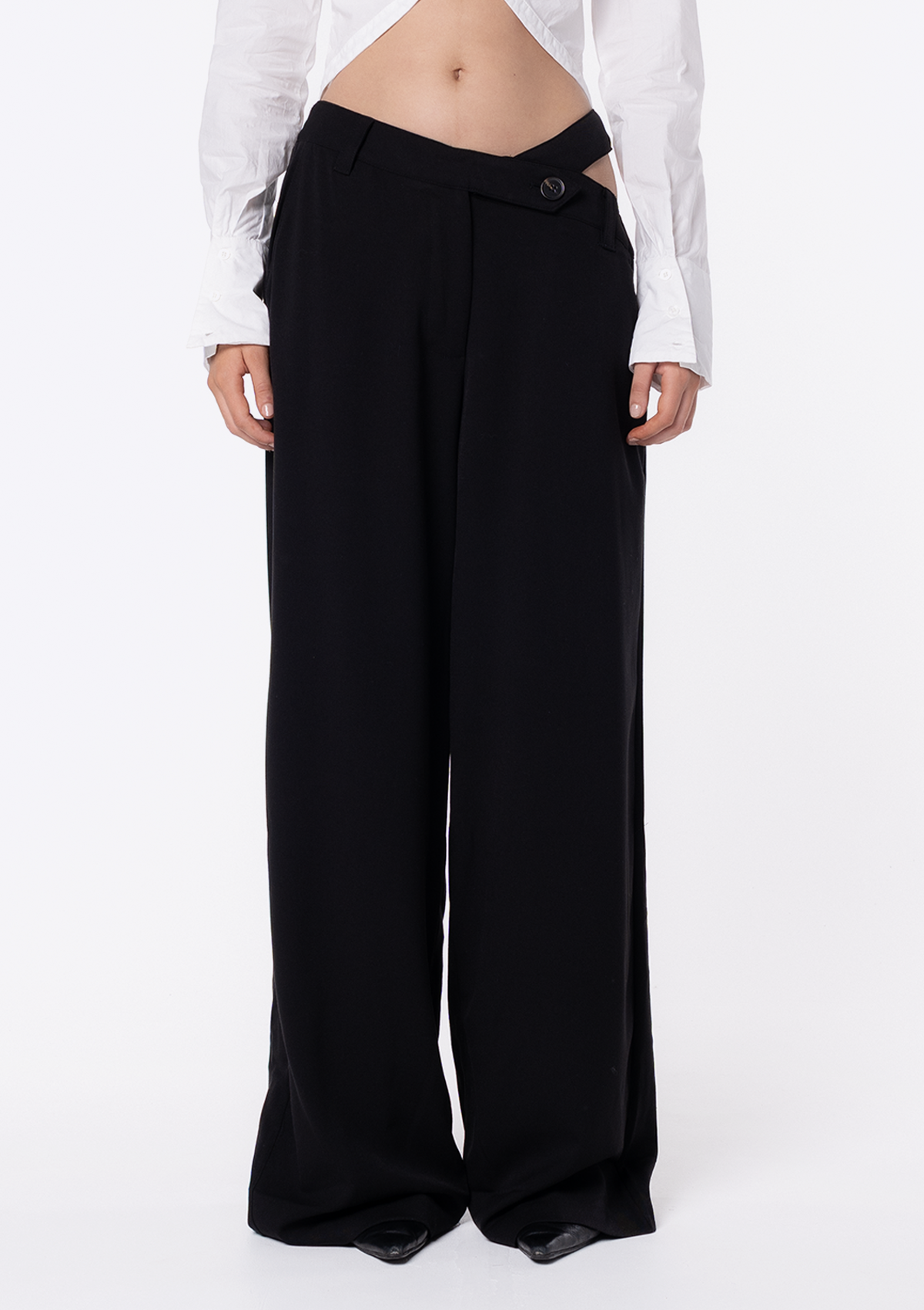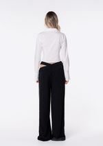 Introducing the JGR & STN Frankie Asym Pant. An old favourite back by popular demand. The perfect tailored pant with an asymmetric waistline and cut out feature on the hip. This style runs slightly large and designed with a relaxed, elongated leg. Consider sizing down if you're concerned about length.