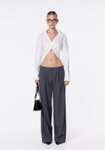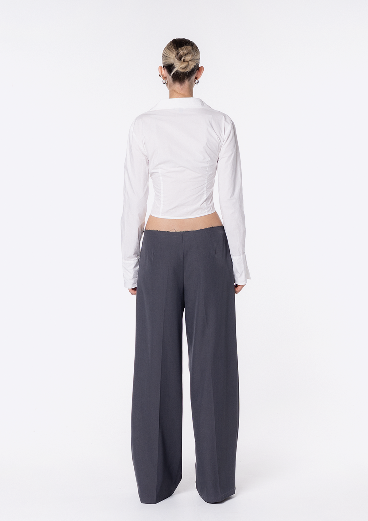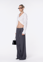 Introducing the JGR & STN Muse Shirt. An elevated take on the classic white shirt, featuring a classic collar and an asymmetrical cropped length with cinched detailing at the centre front placket.